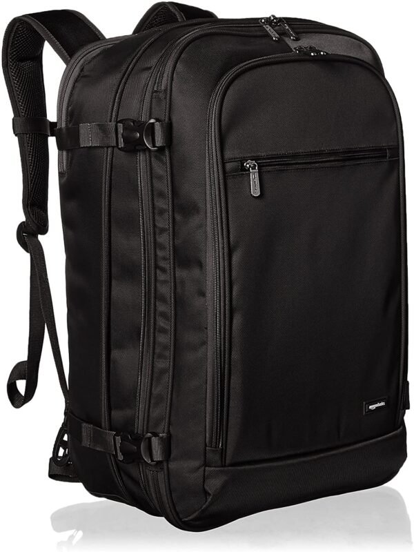 Front pocket and front-top pocket for easy access to documents and travel liquids; main upper packing compartment with organizer, expandable storage space tuck-away ID pocket